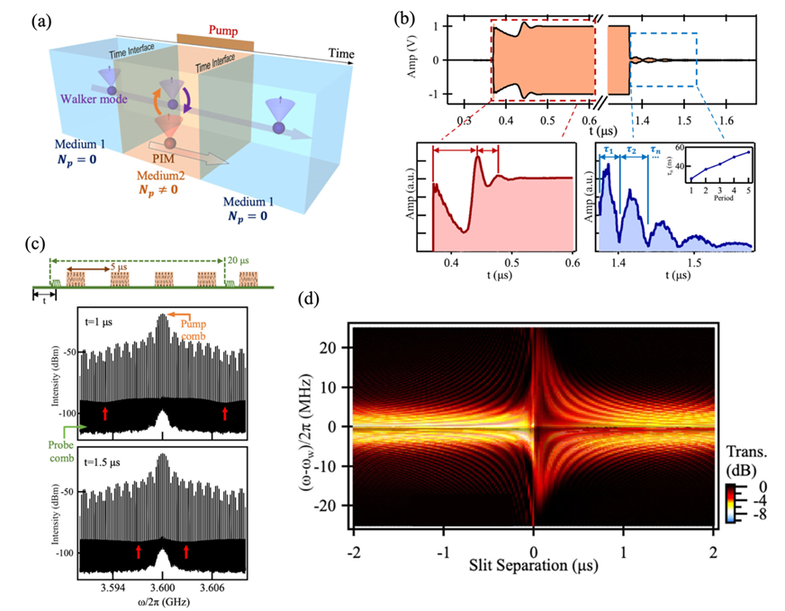 团队的突破点是利用光诱导磁子态(PIM)的非线性优势来解决上述问题。PIM 的等效磁矩很小,只需纳特斯拉量级的微波磁场就能“点亮/熄灭”,相当于一个低阈值的时间开关。当 PIM 与材料中另一个稳定磁子模式(WM)发生强耦合时,PIM 的快速产生和湮灭会在时间轴上形成清晰的“时间界面”,见图2(a)。