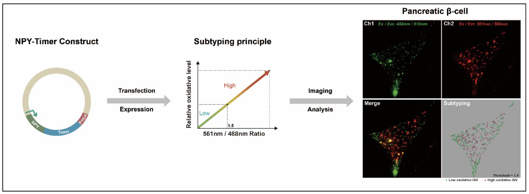 图1. NPY-Timer荧光探针系统工作原理及其在胰岛分泌囊泡氧化还原检测中的应用。